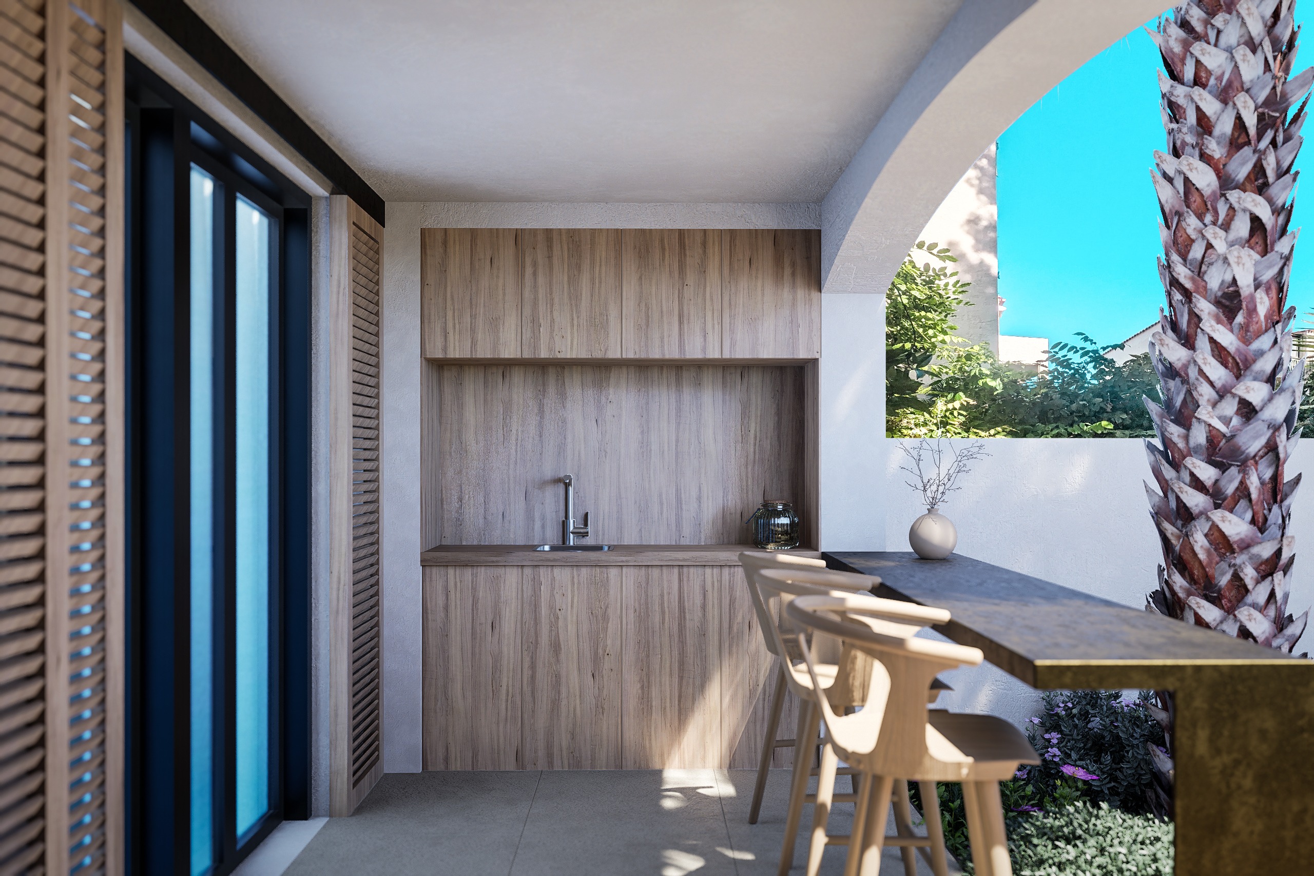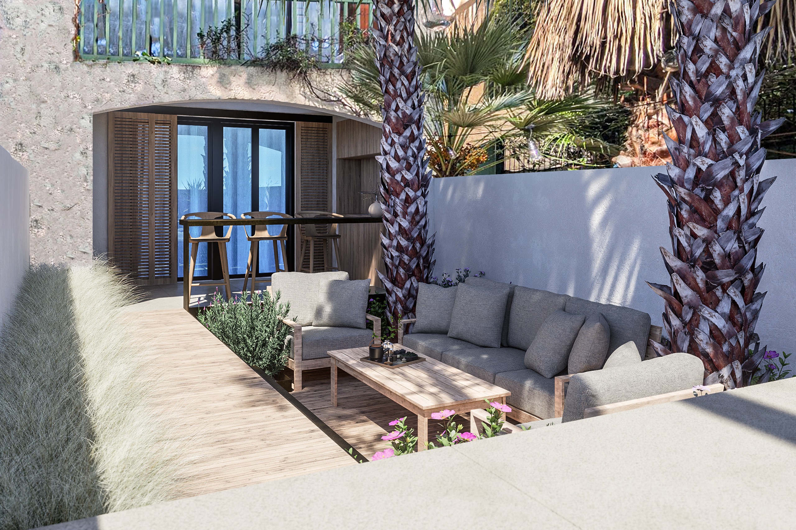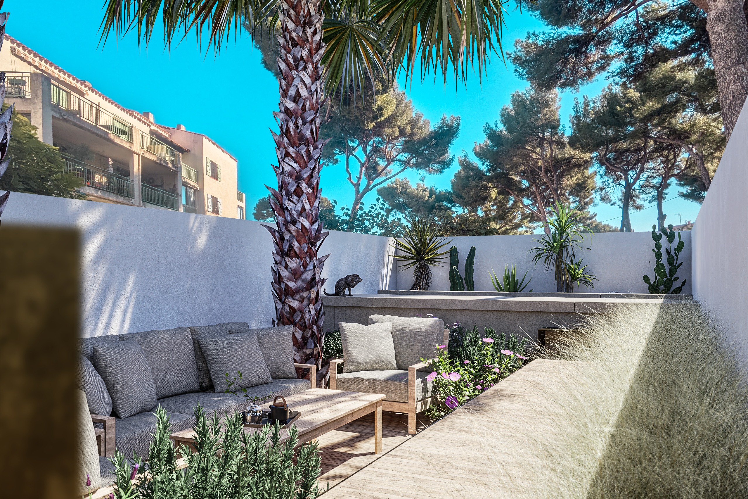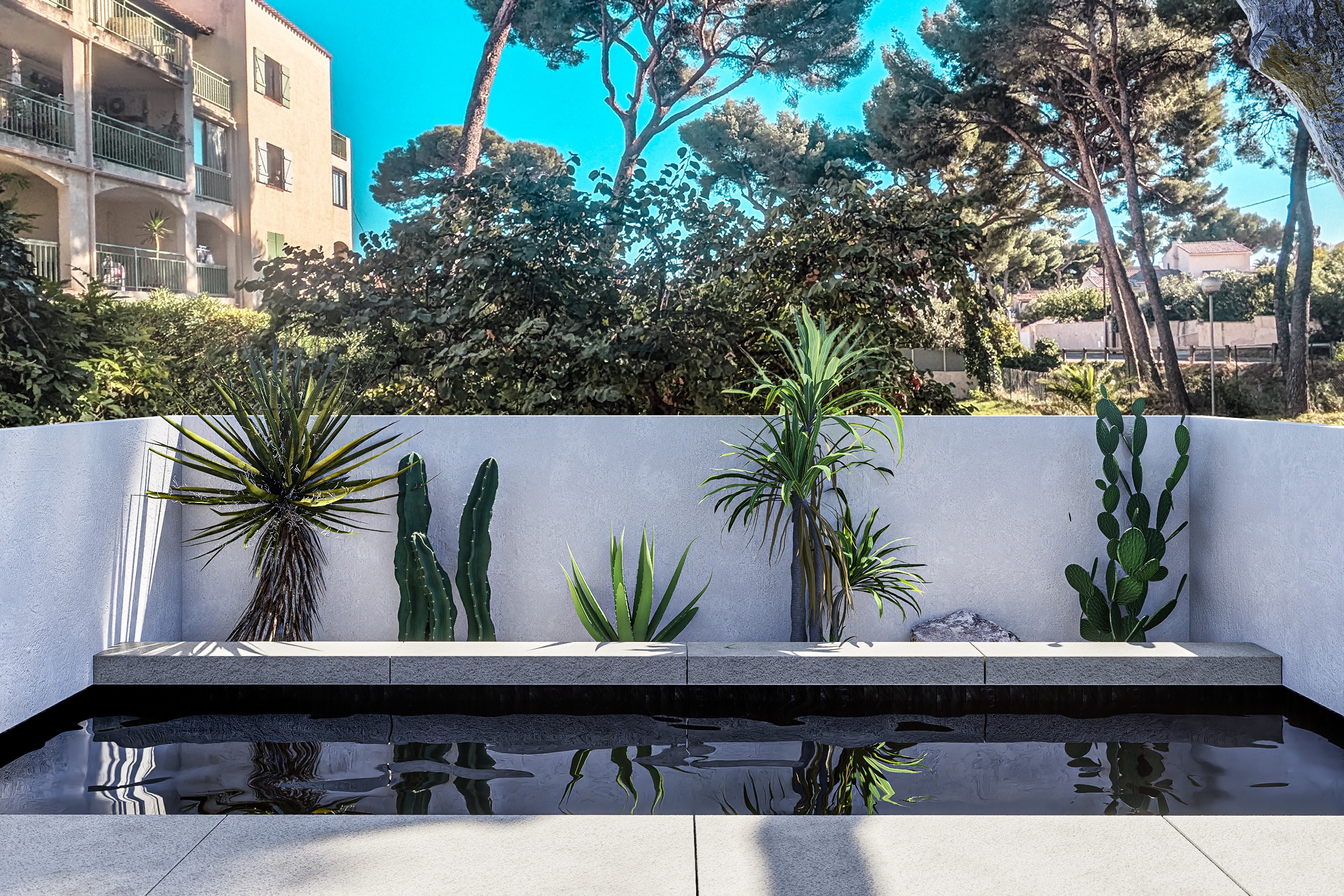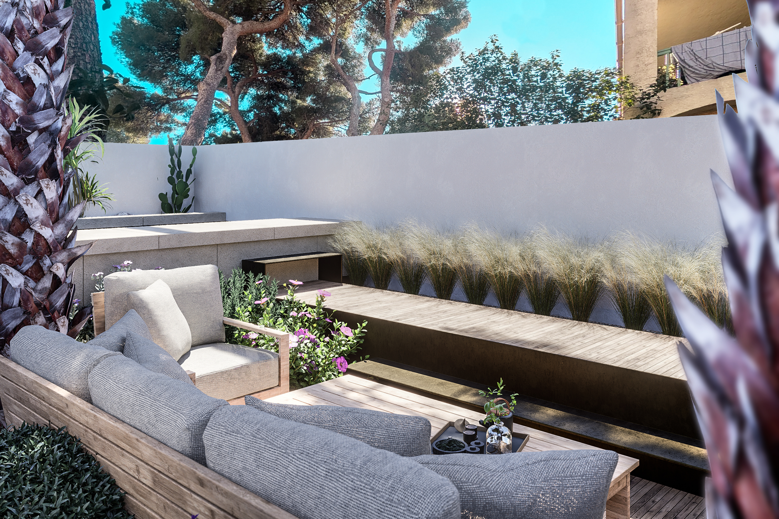 Le projet compose avec les contraintes de dimensions de la parcelle en utilisant les différences de niveaux pour créer une diversité d’usages et d’ambiances. Ainsi malgré la taille réduite, le jardin profite d’une micro piscine et d’un jardin arboré qui apporte fraicheur et réconfort tout au long de l’année.